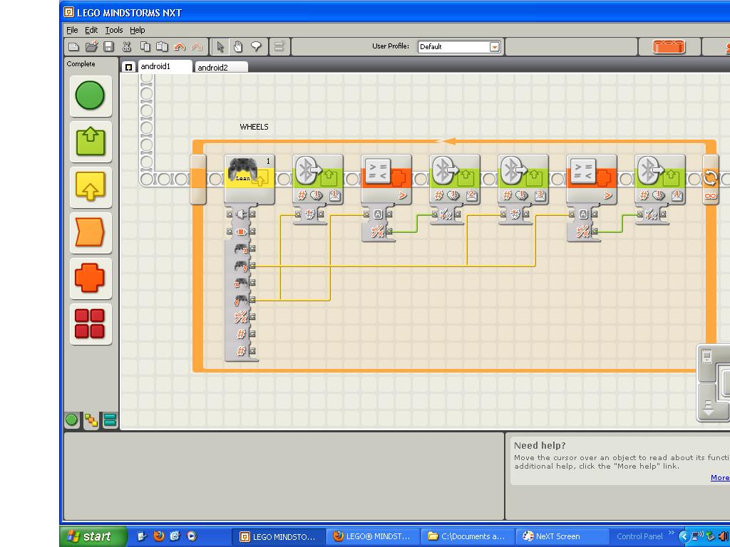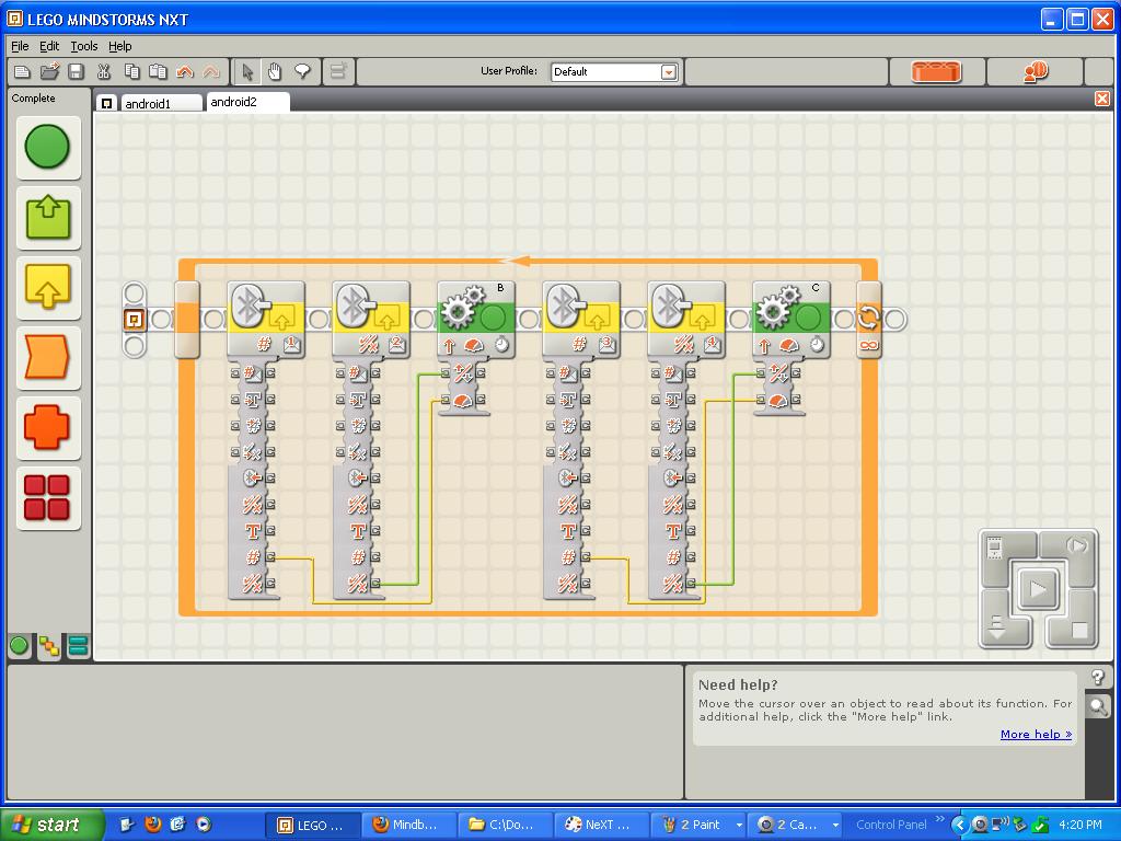 My program has the upper NXT relay the pspnx commands to the lower NXT. The program is like this: