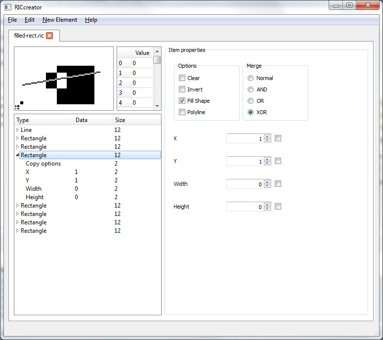 It also means that every drawing method you can use in NXC will be possible to use to modify the sprite, for example drawing shapes with AND and XOR. When I have added it to nxtCanvas you will also be able to write with RIC fonts and draw polygons. If anyone thinks it could be useful to draw another RIC file on the sprite I can add that too.
