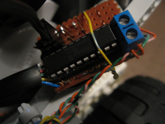 Around the same time, I was toying with the idea of using a PICAXE 20X2 as a servo interface for the NXT. I started working on some different concepts on a breadboard, and came up with satisfying results. I tweaked the code a little, and then soldered together the controller. If anyone is interested, I can post the (sloppy) code for the PICAXE and the NXT. I haven't drawn up a schematic yet, but it is just about as basic as it could be. The only external resistor I used was a 100k pulldown on the rx programming pin to keep it from floating. The I2C pullups are internal; all I had to do was add a line of code to enable them. I am not really sure how strong/weak the pullups are, but they seem to work well with the NXT. The PICAXE itself and the program support 6 servos, but due to my lack of header pins and perfboard, I only soldered it up for three servos. I only use one for this project anyhow.