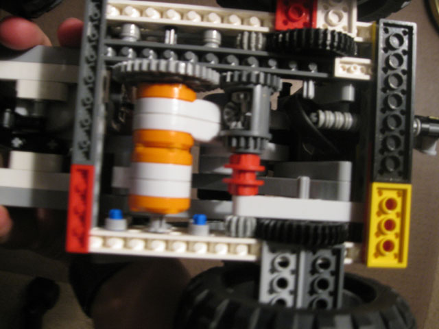 I have previously broken a 12 tooth gear in a differential by apply power from two NXT motors. I didn't want to deal with that hassle again, so I geared it up 5:3. Being a tractor, I wanted it to be powerful, and go slow. I get the power from two NXT motors, and I get slow speeds by gearing down from the differential 3:1. The overall gearing (according to my calculations) is 1:0.55..., so about 2:1. Also note though, that with the huge wheels, it is a fairly good speed for driving.