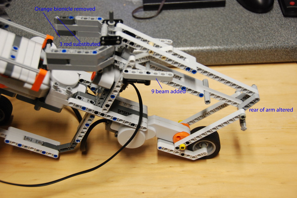 The author has removed the orange Technic Bionicle 1 x 3 Tooth with Axlehole, has added 7 hole beams to stop the Technic Angle Connector #6 just behind the ultrasound sensor from coming apart, and appears to have altered the positioning of the two Technic Beam 4 x 4 Liftarm Bent 53.5 at the end of the arm assembly.